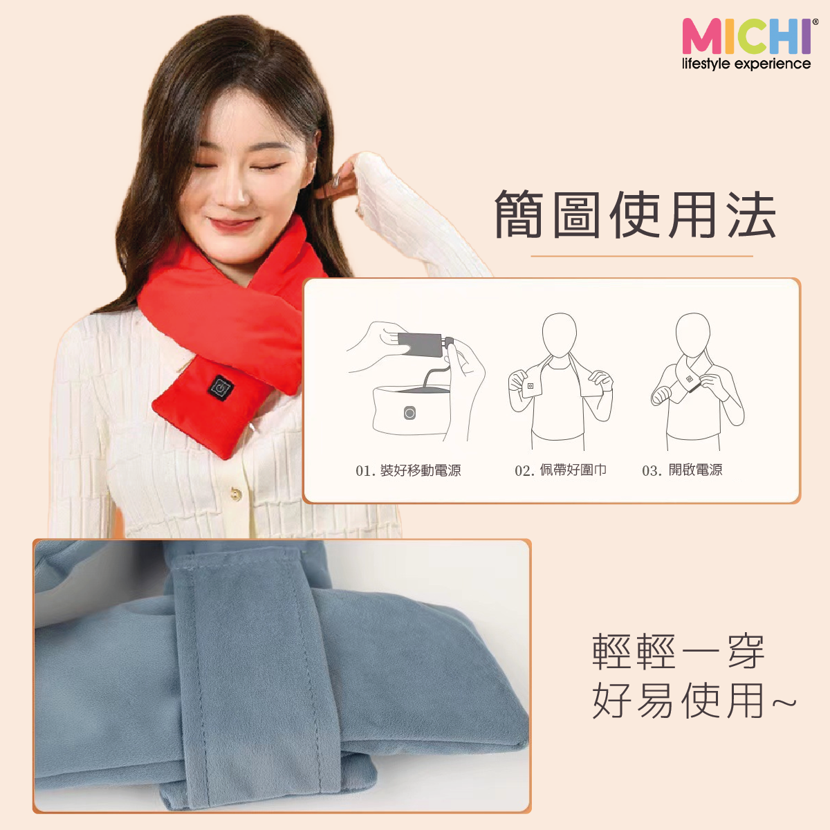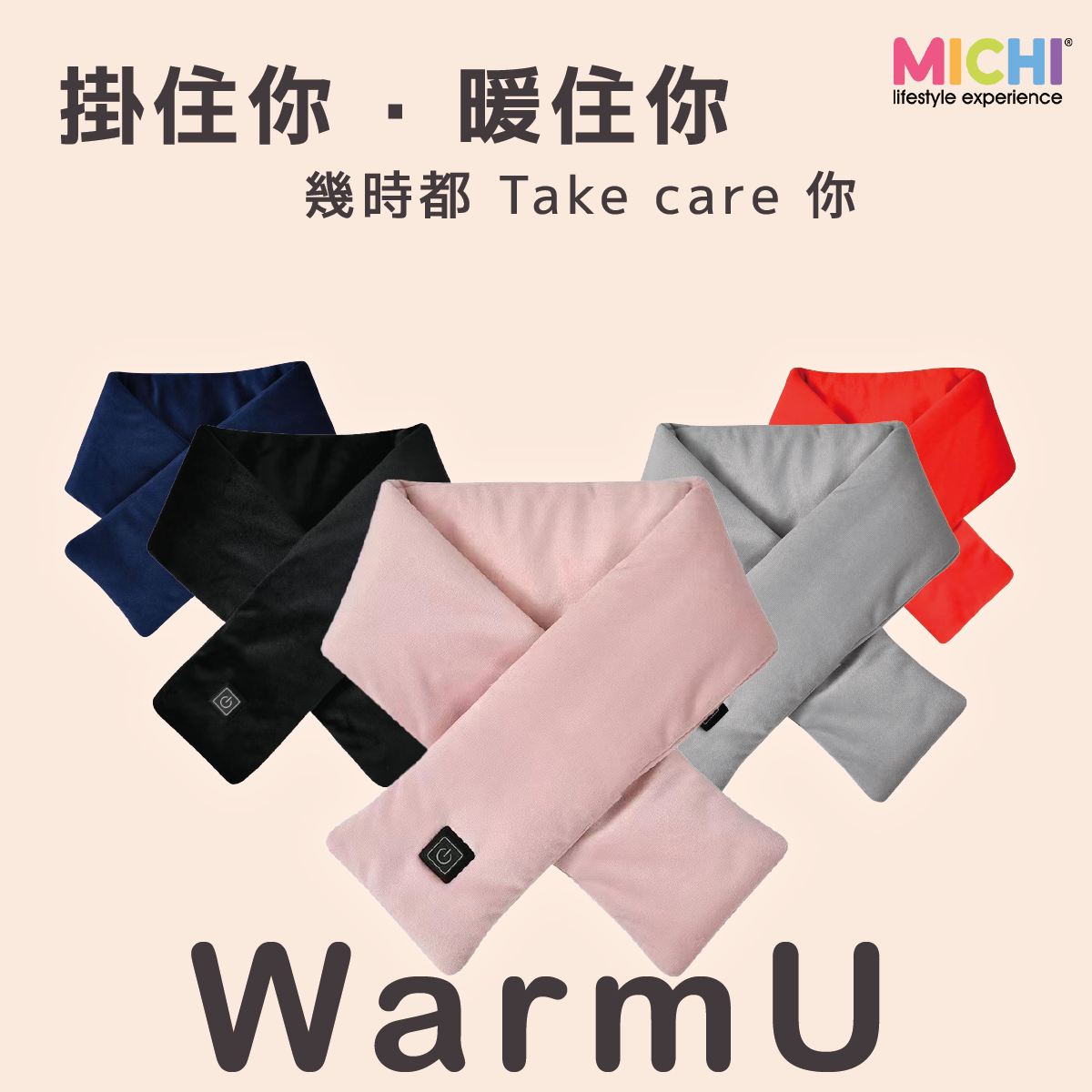 雖然而家天氣乍暖還寒,不過本地原創品牌MICHI已經為大家準備過1個暖笠笠既冬天。MICHI WarmU 發熱頸巾有5種顏色可供選擇,讓大家係冬日可增添點色彩興溫暖,選用柔軟物料呵護你的頸部,而且有3種不同溫度可供調較,最高可達55度,加上可以用水直接沖洗,使用簡單,只要搭配外置電源就可為你送上呵護溫暖。